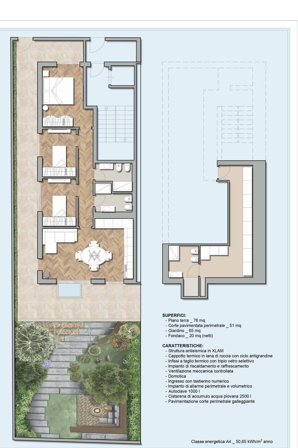 A garantire l'alta efficienze energetica dell'unità sono presenti i seguenti impianti: ventilazione meccanica controllata, impianto elettrico di tipo domotico, impianto di raccolta dell'acqua piovana, impianto di allarme, impianto di riscaldamento a pavimento e raffrescamento, autoclave, videocitofono, portone blindato, infissi in alluminio con triplo vetro basso emissivo. Bassi costi condominiali.